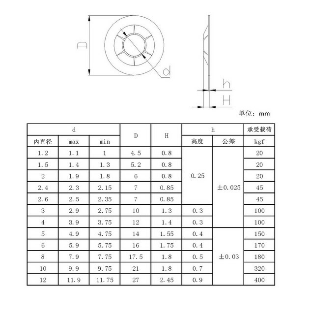 | NO | 訂貨型號(hào) | 外徑 ±0.05mm | 彈片高度 ±0.05mm | 行 程 ±0.05mm | 克力值G 克力值N | 回彈系數(shù) ±15% | 保證壽命 萬(wàn)回 | 表面處理 | 推薦 高度差 | 材質(zhì) | | 1 | 3016 | ф3.0 | 0.17 | 0.14 | 160±20 1.57±0.2 | 60 | 20 | Ag | 0.02 | sus | | 2 | 3514 | ф3.5 | 0.18 | 0.15 | 140±30 1.37±0.29 | 60 | 30 | Ag | 0.02 | sus | | 3 | 3525 | ф3.5 | 0.21 | 0.17 | 250±50 2.45±0.49 | 60 | 20 | Ag | 0.02 | sus | | 4 | 4006 | ф4.0 | 0.15 | 0.15 | 60±30 0.59±0.29 | 50 | 100 | Ag | 0.05 | sus | | 5 | 4010 | ф4.0 | 0.16 | 0.15 | 100±30 0.98±0.29 | 50 | 100 | Ag | 0.05 | sus | | 6 | 4016 | ф4.0 | 0.18 | 0.17 | 160±30 1.57±0.29 | 60 | 50 | Ag | 0.05 | sus | | 7 | 4026 | ф4.0 | 0.20 | 0.19 | 260±50 2.55±0.49 | 60 | 30 | Ag | 0.05 | sus | | 8 | 4506 | ф4.5 | 0.16 | 0.16 | 60±30 0.59±0.29 | 50 | 100 | Ag | 0.05 | sus | | 9 | 4510 | ф4.5 | 0.19 | 0.18 | 100±30 0.98±0.29 | 50 | 100 | Ag | 0.05 | sus | | 10 | 4516 | ф4.5 | 0.19 | 0.18 | 160±30 1.57±0.29 | 60 | 50 | Ag | 0.05 | sus | | 11 | 4526 | ф4.5 | 0.21 | 0.20 | 260±50 2.55±0.49 | 60 | 30 | Ag | 0.50 | sus | | 12 | 4514 | ф4.5 | 0.23 | 0.22 | 140±20 1.37±0.2 | 50 | 20 | Ag | 0.50 | C5210R | | 13 | 5010 | ф5.0 | 0.21 | 0.20 | 100±20 0.98±0.29 | 60 | 20 | Ag | 0.05 | C5210R | | 14 | 5017 | ф5.0 | 0.24 | 0.22 | 170±30 1.67±0.29 | 60 | 20 | Ag | 0.05 | C5210R | | 15 | 5022 | ф5.0 | 0.27 | 0.25 | 220±30 2.16±0.29 | 60 | 20 | Ag | 0.05 | C5210R | | 16 | 5025 | ф5.0 | 0.27 | 0.25 | 250±30 2.45±0.29 | 60 | 20 | Ag | 0.05 | C5210R |